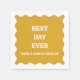 Celebrate your special day in style with these customisable "Best Day Ever" wedding napkins, featuring a retro mustard yellow background and bold navy text. The whimsical scalloped edge adds a playful yet elegant touch, perfect for modern weddings, bridal showers, or rehearsal dinners. Easily personalise with your names and date for a personalised accent that guests will love. The contrasting colours and bold font make these napkins an eye-catching detail for your table settings, elevating the aesthetic of your event. Ideal for couples looking to combine classic elegance with a fresh, contemporary twist, these napkins bring a chic charm to any celebration.