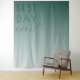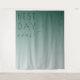 This wedding backdrop features a minimalist design with a gradient background transitioning from dark teal to light green, creating a fresh and calming atmosphere. The phrase "BEST DAY ever" is prominently displayed in bold uppercase letters paired with elegant cursive script, adding a touch of whimsy and celebration. The modern and sophisticated aesthetic emphasizes the text, making it perfect for capturing joyful moments on your special day. Its clean lines and soothing colour palette evoke positivity and optimism, ideal for any wedding setting.