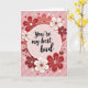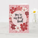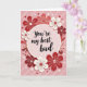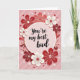 This greeting card features a blush-pink circle in the center that frames the message, “You’re my best bud.” The text is written in a flowing black script and sits neatly in the middle of the circle, easy to spot at first glance. Around it, there’s a thick ring of stylized flowers in deep crimson, cherry red, and soft cream, with layered shapes that look a bit like cut paper. Small hearts are tucked between the flowers, some white and some deep red, adding a sweet touch of romance and friendship ❤️. The background is a light pastel pink with faint diagonal stripes that give it a little texture without pulling attention away. Overall, the card feels warm and caring, like a simple reminder that someone matters