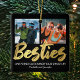 Personalized best friends christmas ornament featuring a trendy black background that can be changed to any color, the word "besties" in a faux gold foil script font, a friendship quote, your names, and 2 square photos on both sides.