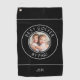 You can easily create your own golf towel with our simple template. Just upload your favourite photo and add initials, name, or any text you like. You can also pick the colours of the text and the background to suit your golfer's taste. The photo and the text are printed in white with two circular white borders, which stand out against the solid black background.
