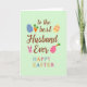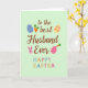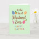 This design shows a pale mint-green background with the main message, “to the best Husband Ever,” centered in smooth, flowing brown lettering that feels like a gentle note between close partners. Small, simplified spring icons gather around the words, adding a cozy, affectionate mood without crowding the space. In the upper left, a pair of orange root vegetables with leafy green tops sits near a blue egg decorated with tiny white dots, like little gifts tucked beside a love note. Across from it, a yellow egg with pink zigzag lines brings a bright contrast that keeps the layout lively, with a hint of flirty energy. Lower on the card, a pink bunny head 🐰 with upright ears and a sweet, friendly expression appears near a pink egg covered in white dots and another orange root vegetable, creating a warm, companionable cluster. Near the bottom, “HAPPY EASTER” is placed in alternating soft blue, orange, and pink letters, lined up neatly beneath the illustrations, with a small 🌷 touch that fits the spring theme. The blue egg’s white polka dots are evenly spaced, and the yellow egg’s pink zigzags run diagonally in tidy rows.