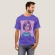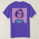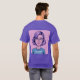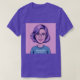 This is a Best Internet Marketer T-Shirt. The design was produced with generative art. The art is comic illustration of a woman with lavender hair and glasses. She is smiling and wearing a teal shirt with the text Best Internet Marketer. She has pink lipstick on. The image background is pink. The image is on the front and back of the t-shirt. You can change the image with the Personalise link. The t-shirt is a purple t-shirt.