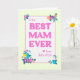A pretty Mother's Day card for the BEST MAM EVER. The design has a yellow check gingham border surrounding the words, 'To the BEST MAM EVER from Bothl of Us, in magenta pink lettering on a lightly textured white background. There are bright clusters of multi-coloured flowers in the corners and a small magenta pink heart. The inside message can be customised or deleted if you wish.