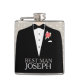 Smartly dressed best man in tuxedo and black bow tie graphic wedding hip flask. Reads Best man Joseph. Personalise with your own name and title. A great personalised gift idea for male bonding on bucks nights / stag nights, wedding rehearsals or as a wedding favour.