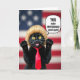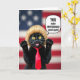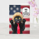 This card features a black cat posed like a tiny speaker, angled forward with both front paws lifted as if making a point. It wears a light blond hairpiece and a neatly tied red necktie, giving the scene a funny, affectionate formality that feels like a friendly inside joke ❤️. The cat’s big yellow eyes, open mouth, and flared whiskers suggest it’s mid-speech, and the energetic expression adds a teasing sense of closeness. Behind it, a softly blurred stars-and-stripes pattern sets the stage without stealing attention from the cat. Near the cat’s head, a white speech bubble holds an all-caps message in dark lettering, positioned so it reads like the cat is “saying” it. The strong contrast between the dark fur, bright eyes, pale hairpiece, and red tie makes the central figure pop against the muted background 🌼. The background shows faint stars in the upper area and soft horizontal stripes across the rest of the scene.