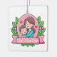 Adorable ornament ideal for Mother's Day. A cute illustration of a mother and her child giving each other a loving hug. Both are wearing a blue shirt and have brown hair. Both have a loving smile and rosy cheeks. They are set inside a pink circle with sparkles and two love hearts dotted around. Below them is a pink banner with an elegant script reading 'Best Mum Ever', this is a template that can be used as it is or replace the original text with your own to personalise. Surrounding the circle and banner are green leaves and pink flowers. A pretty drawing ideal for your mum.