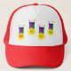 A red and white trucker hat decorated with four medal motifs, made from handpainted paper collage.