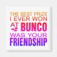 Modern typography style text for your Bunco best friend. Bunco dice sentiment reads: The best prize I ever won at Bunco was your friendship. Colourful and made just for Bunco players. Great as friendship gift.