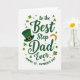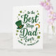 This greeting card features the message “to the Best Step Dad Ever” centred in rich emerald green, with the words arranged to feel close and affectionate on a bright white background 💚. Around the main line, small dark-green shamrocks and tiny starburst marks scatter like a gentle frame, giving the space a cosy, celebratory look ☘️. A slightly tilted leprechaun hat sits near the title, coloured deep green with a golden buckle that catches the eye. Nearby, a gold horseshoe curves in an arc, adding a warm, lucky accent beside the green lettering. The layout feels like a friendly hug on paper, with the symbols tucked in as if they’re leaning towards the message. At the bottom, “HAPPY ST. PATRICK’S DAY” curves upward in matching green, clearly separated from the main text. Darker shamrocks dot the corners while the hat and horseshoe sit closer to the centre, balanced against the open white space.