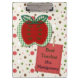 This is a cute clipboard for a favourite teacher. It features a bright red half apple with green seeds and leaves, and framed with a green and white gingham check pattern. At the bottom is a red note clipped with a clothes pin image that holds your custom text. The images are both placed on a fun red, green, and white polka dot background. The back of the clipboard has the same pattern as the front. Cute, and easy to personalise. *Clip art used in this design is copyrighted by Encore Software, Inc., which permits use to its licensors. All rights reserved.