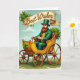 This St. Patrick's Day card features a dapper, almost storybook gentleman in an emerald suit and matching top hat, with a sunny yellow waistcoat and a fiery red beard that stands out against the sky. He holds the reins with a steady, gentle grip, as if guiding someone special along for the ride, and the scene feels friendly and close without anyone needing to say a word 💚. Beside him sits an ornate golden-yellow carriage with classic spoked wheels resting on a rich green patch of grass, its deep red cushioned interior adding a cozy touch. A four-leaf clover emblem decorates the carriage, surrounded by clusters of shamrocks that curl around the edges like a leafy frame ☘️. Across the top, a warm cream banner stretches overhead, carrying the words “Best Wishes” in dark lettering centered neatly on the ribbon. Behind everything, the background is a calm blue sky with soft, billowy clouds drifting past. The shamrocks and a larger four-leaf clover gather around the banner and carriage, with bright highlights catching the polished metal and the folds of the green suit.