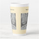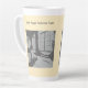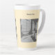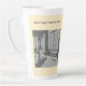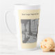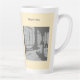 The Latte Mug features a calm, sand-like design in warm beige and natural tones, reminiscent of fine beach or desert sand. A subtle artistic illustration is printed: a young woman sitting cross-legged in a classic yoga pose.