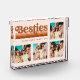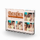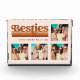 This trendy and boho photo block features terracotta retro text that says "Besties" and a vintage style striped graphic in neutral colours on a soft, blush background. There is room for four of your personal photos, plus a spot for the names of you and your best friends.