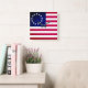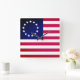 The Betsy Ross flag is a reconstructed early design for the flag of the United States, which is conformant to the Flag Act of 1777 and has red stripes outermost and stars arranged in a circle. These details elaborate on the 1777 act, passed early in the American Revolutionary War, which specified 13 alternating red and white horizontal stripes and 13 white stars in a blue canton. Its name stems from the story, once widely believed, that shortly after the 1777 act, upholsterer and flag maker Betsy Ross produced a flag of this design.