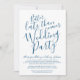 Typographic script modern simple navy blue text on a white background design post-wedding invitation reads better late than never wedding party. Simple modern contemporary design, personalise with your own wedding after-party belated wedding venue, brides and grooms names and reply details on the front and your favourite wedding photo from your wedding day on the reverse. Matching wedding products and other colour options available in the store. © Design by Sarah Trett for www.mylittleedenweddings.com