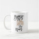 A fun quote in bold typography Better Latte Than Never on this coffee mug.