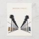 Minimalist illustration of a Beverly Hills street lined with tall palm trees and stylized boutique shop fronts in rich, neutral colors.