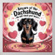 This design seamlessly blends warning and affection in a way that only a dachshund lover can appreciate. The artwork features a charming dachshund front and centre—eyes bright, ears perked, and a mischievous yet loving grin on his face. The dog stands by a whimsical “Beware” sign, but instead of projecting menace, his pose exudes irresistible charm. Around him, a trail of heart-shaped paw prints leads from the sign right to the viewer, visually capturing the idea that this little dog is on a mission to steal your heart.