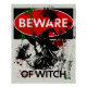 Fun sign "Beware of Witch" with a witch, blood, and green and black matter splatters.