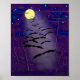 The bewitching hour is nearing, spooky fun with bats, a full moon, stars, purple mist and tree silhouettes on this poster print.