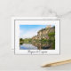 Postcard with the castle and the village of Beynac-et-Cazenac built upon the cliffs alongside Dordogne river in the early morning with reflection in the river and a kayak in the foreground. The town is situated in the Perigord in France. It has a white border and the text: 'Beynac-et-Cazenac'.