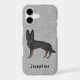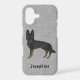 Destei's original cartoon illustration of a black bi-colour German Shepherd breed dog. The background colour is grey with a decorative texture. The texture can be removed and the background colour can be changed to any other colour, if so wished. There is also a personalizable text area for a name or other custom text.