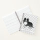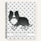 Destei's original cartoon illustration of a cute Shetland Sheepdog breed dog in black and white coat colour. Under the dog there is a personalizable text area for the title of the notebook. The background has a pattern of grey dog paw prints.
