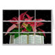 red Christmas poinsettia with open Holy Bible in snowy windowpane frame with snowflakes