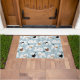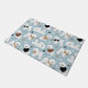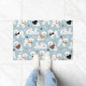 Cute bichon frise dogs in sweaters and bows with scattered dog bones and paw prints on a light blue background.