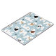 Cute bichon frise dogs in sweaters and bows with scattered dog bones and paw prints on a light blue background.