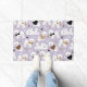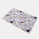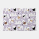 Cute bichon frise dogs in sweaters and bows with scattered dog bones and paw prints on a light purple background.