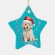 An adorable Bichon Frise dog wears a red and white Santa hat and sits among a swirl of silver stars on the front of this Holiday ornament. The image is placed on a bright teal blue background. The back of the ornament has the same silver star background, with two custom text fields in white.
