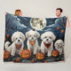 Unleash the spooky spirit with this eerie Halloween design featuring a pack of dogs under a dark, moonlit sky, surrounded by flying bats and glowing pumpkins. Perfect for those who love a touch of frightful fun with their furry friends!