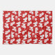 Cute Valentine's Day Bichon Frise dogs wearing red, pink, and white polka dot and heart sweaters with scattered paw prints and arrow on a red background.