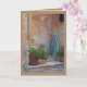 This scene of a turquoise bicycle and a potted red geranium on a front stoop. Blank inside with area for your own message.