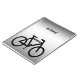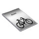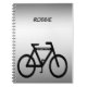 This notebook features a contemporary design of an abstract pattern of a black bicycle on a silver, grey and white metallic background. The name can be customised or removed.