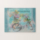 Bicycle with flower baskets on blue burlap jigsaw puzzle