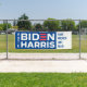Joe Biden and Kamala Harris presidential election banner. Customize with your own caption! What reads here: Make American Sane Again - can be altered into any other statement.
