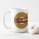 Three big graphic bagels are depicted on this mug. They overprint each other with a slight transparency and a panel with a message running through the holes. The golden colours mimic bagels with dots added to add the suggestion of a salt and poppy seed bagel. Great as a promotional item. Available with matching products.