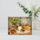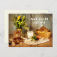 Retro postcard featuring a lovely teddy bear at a table with fresh food and flowers. Beautiful to wish someone a fast recovery.