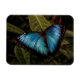 Blue Morpho butterfly shows off his brilliant, blue wings ( 5 - 8 inches span) while resting on foliage at butterfly wonderland. Photo by Ruth Jolly.