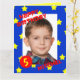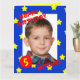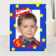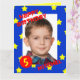 This big birthday card features your photo as the focal point surrounded by a blue frame with yellow stars on it. The words "HAPPY BIRTHDAY" appear in red on the top left of the photo and the birthday boy's name appears at the bottom right with the birthday age which can be customised in a red circle on the bottom left. This is a very unique large birthday card which is great for children who are boys. Copyright Kathy Henis