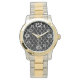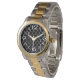 This men's watch has an art deco design of white half circles connect with lines on a field of black.