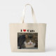 This jumbo tote says, "I Love (heart) Cats!" It shows a closeup photograph of a cat named Big Boy. Big Boy is a grey striped cat with alluring green eyes, white paws, white chest and white around his mouth and freckled nose. A handsome cat and a perfect tote for all your needs.