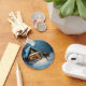 Beautiful 12 point buck on a quiet snowy evening standing in front of a log cabin home with small twinkle lights in the trees an a homey lighted porch.