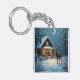 Beautiful 12 point buck on a quiet snowy evening standing in front of a log cabin home with small twinkle lights in the trees an a homey lighted porch.