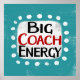 "Big Coach Energy" is a cute text design in blue with black and red text, along with a white accent shape and white textured whimsical dots surrounding it.