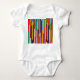 This baby bodysuit has a geometric design of colourful stripes running vertically.