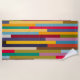 This beach towel has a geometric design of colourful stripes running vertically.